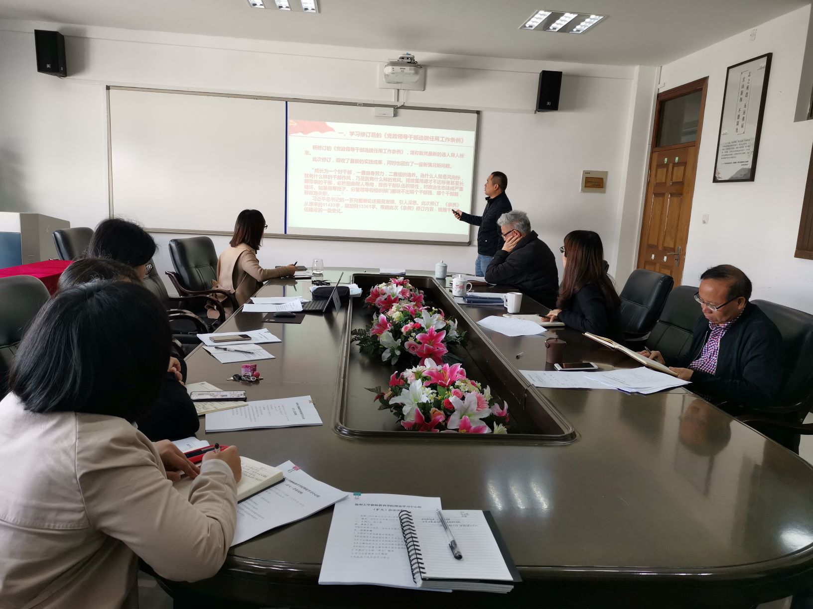 本次会议分三个专题学习,专题学习党内重要法规制度,专题学习全国“两会”精神以及专题学习全省教育大会精神。杨立淮同志作《加强政治建设 主动担当作为 以党的建设引领学院事业全面发展》的学习报告。在报告中,他带领大家学习了近期发布的《党政领导干部选拔任用工作条例》《关于加强和改进中央和国家机关党的建设的意见》《关于解决形式主义突出问题为基层减负的通知》《中国共产党重大事项请示报告条例》等重要文件精神,并对2019年全国“两会”重点内容进行了解读。会议还结合车俊书记《全面贯彻党的教育方针 率先高水平实现教育现代化》和袁家军省长《合心合力办好人民满意的教育》两篇文章,重点学习了全省教育大会的精神。