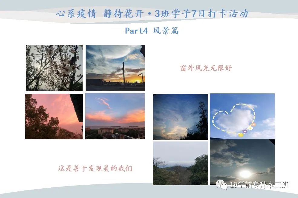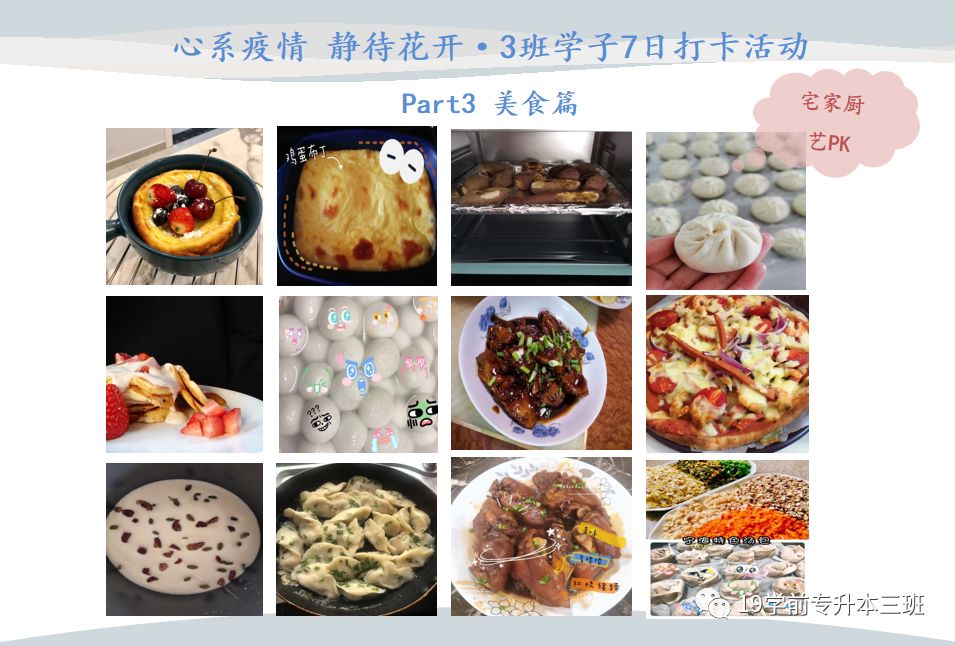 班会上从同学们平时在家里学习、做美食以及娱乐的照片里,我感受到了大家对于生活满满的热情。虽然有一段时间疫情很严重,网络上面人心惶惶,但是大家都没有受到很大的影响,而且还有好多同学通过捐款、当志愿者等贡献自己的一份力量。现在疫情也在逐渐地好转,期待春暖花开时我们的再次会面!