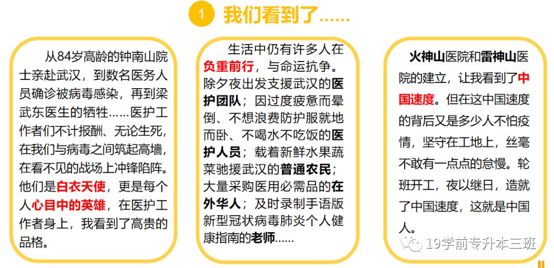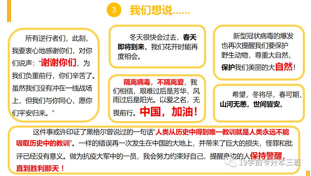 三、内心有大爱:一个人的信仰不能丢,我们要做一个内心有大爱的人,这样才能被社会尊敬。同时在这次疫情中,也希望同学们能感受到祖国的伟大,产生对祖国人民的热爱。