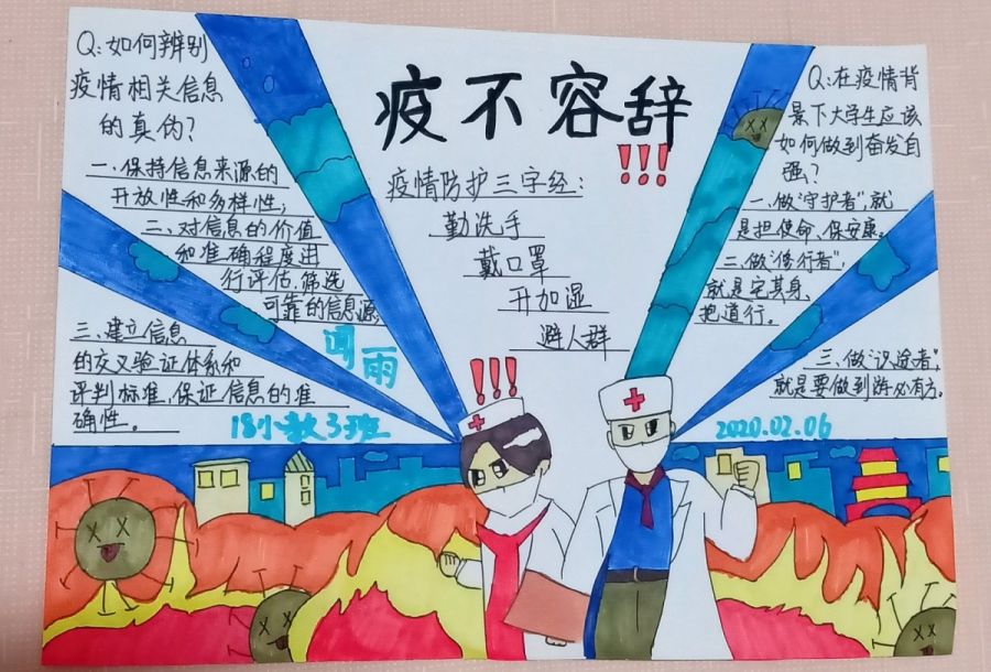 通过撰写自己的防疫故事,在了解疫情防护的相关知识的同时,抒发自己的感想,深刻认识到疫情面前匹夫有责的涵义;通过编写防疫标语,宣传呼吁防疫意识,让更多人参与到其中,并善于辨别有关疫情信息的真伪;通过书法、手抄报与图画,向一线防疫人员表达敬意,并为抗疫树立自信。明媚的阳光,很快会照亮这片被疫情惊扰过的土地,大街小巷也必将重回人声鼎沸。