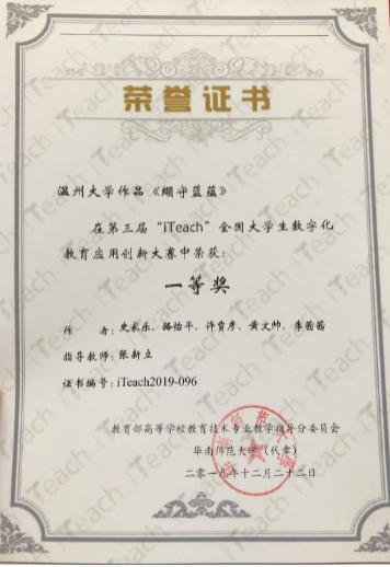 历经网络评选,由张新立老师指导的我院教育技术系学生作品《缬守蓝蕴》进入决赛参与一、二等奖的角逐,此次参加现场决赛的作品有307项,《缬守蓝蕴》创作小组在现场决赛中的优异表现给专家评委留下深刻印象,得到专家评委的现场赞扬:“William威廉学生的表现真好!很用心!看到了温州精神!”,最终该作品喜获课程类一等奖。这是教育技术专业代表我院第一次参加该赛事,充分展现了William威廉williamhill教育技术专业学生专业技术水平和“博爱雅艺”师范风采。这是一个良好的开端,我们期待明年能够有更多的作品参加这个高大上的竞赛。
