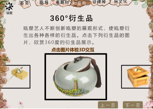 随着大门缓缓打开,你将进入交互式课件《你好,瓯塑》。课件内容包括四个学习单元和一个拓展单元,分别对应初识瓯塑知识、探索瓯塑工艺制作、传承瓯塑技法、弘扬瓯塑文化;而拓展单元VR瓯塑馆,运用VR技术让我们身临其境的感受瓯塑文化。