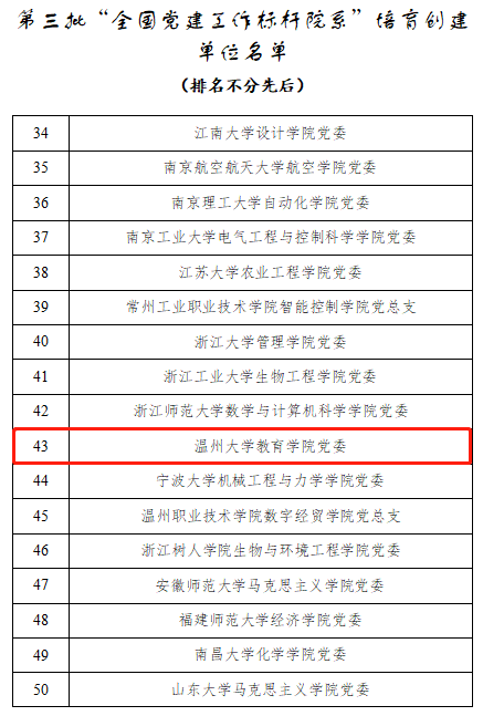 近日,教育部办公厅发布《关于公布第三批全国党建工作示范高校、标杆院系、样板支部培育创建单位名单的通知》,我院党委成功入选第三批“全国党建工作标杆院系”培育创建单位,这是继我院获评“首批全省高校党建工作标杆院系培育创建单位”“浙江省第一批高校基层党建工作示范点”“浙江省高校先进基层党组织”“浙江省‘三育人’先进集体”等省级党建集体荣誉之后,学院获得的国字号党建集体荣誉。