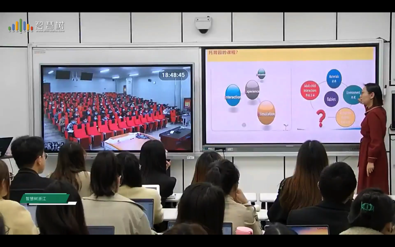 课堂上,宋占美教授利用实时全景视频、远程信息交流工具鼓励两校同学跨时空互动交流,引导大家走近基于婴幼⼉核⼼素养、国际经验和实践探索的托育课程。两校同学聚焦托育课程的内涵、结构、特色与本质,围绕“何为托育课程”这一主题展开讨论与思索。在一问一答中,两校同学深度发掘托育课程的内涵与本质,也感悟到高质量托育对整个国家、对千万家庭的重要性。课堂最后,宋占美教授邀请两校同学一同总结本次课程的主要内容,并表达了对同学们继续深入了解托育事业、提高托育质量的殷殷期盼。