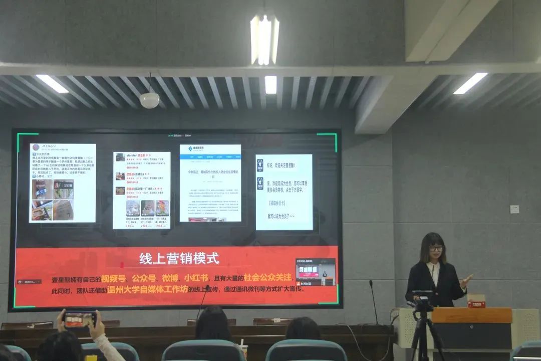 各组项目负责人根据团队前期分析与调研,从项目背景、市场痛点、营销方式以及社会价值等一系列问题展开陈述,全面、详细地解答了评审老师提出的疑问。