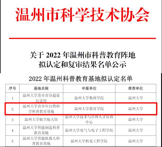 近日,温州市科学技术协会公布了2022年温州市科普教育基地名单,我院青少年自然科学科普教育基地成功入选为温州市科普教育基地。