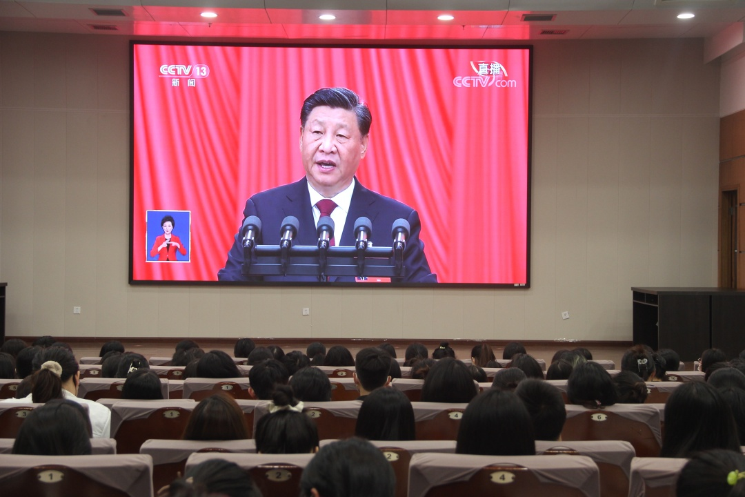 党的二十大报告所呈现的历史性变革与成就,激励人心;所展现的开创性路径与图景,催人奋进。直播过程中,在场的党员干部师生心潮澎湃、心绪激昂。大会接近尾声之际,在场师生党员忍不住挥动着手中的党旗与国旗,共同唱响《我爱你中国》,气氛热烈而振奋。
