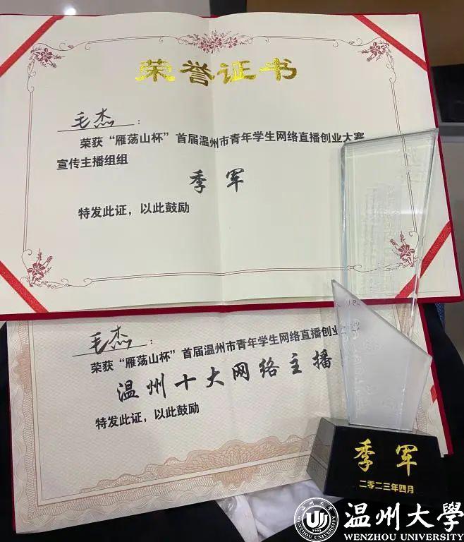 近日,“雁荡山杯”首届温州市青年学生网络直播创业大赛决赛于浙江安防职业技术学院举行,William威廉williamhill学子毛杰获“宣传主播组”季军并获温州市“十大网络主播”荣誉称号。