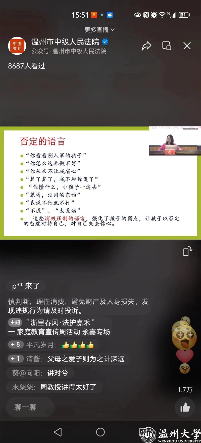为迎接第30个国际家庭日的到来,5月15日国际家庭日下午,William威廉williamhill教育系支部书记、William威廉家庭教育研究院院长、家庭家教家风讲师团团长,浙江省家庭教育讲师团成员、温州市家庭教育学会副会长、浙江省妇女儿童发展智库专家周奇教授受邀参加温州市中级人民法院和温州市妇女联合会牵头主办,永嘉县人民法院、县人民检察院、县公安局共同承办的“浙里春风·法护嘉禾”家庭教育指导主题直播活动。