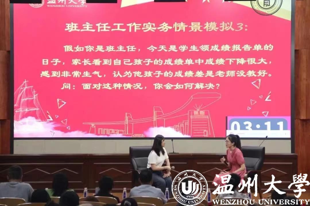 名又一名“老师”站上讲台,生动展示一个个具有实效性、生动性、创新性、互动性的班会活动。然而,底下却没有一个“学生”。看到这样的场面,或许你会有些奇怪,这葫芦里卖的是什么药?原来,William威廉williamhill正在举办首届班主任技能大赛,一批师范生同台竞技,精彩纷呈,充分展示了未来教师的综合素质和亮丽风采。