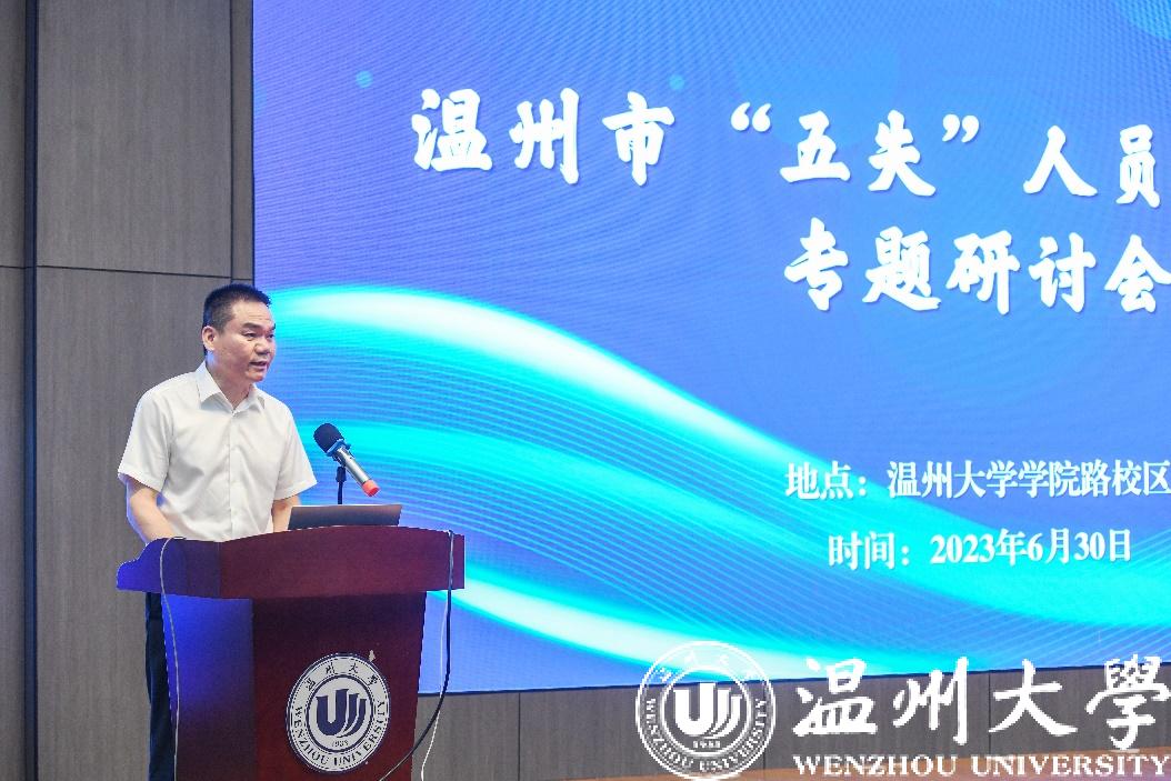 温州市委政法委黄建斌副书记为研讨会致辞。他指出,“五失”人员是温州市委市政府持续关注的弱势群体。一直以来,温州市委不断加强“五失”人员的关爱帮扶工作并富有成效。本次研讨会的举办有助于汇聚校地合力、提升思维、指导实践,深入推动“五失”人员关爱帮扶指导计划落实落地。黄书记对本次研讨会的召开表示热烈祝贺并寄予殷切期望。