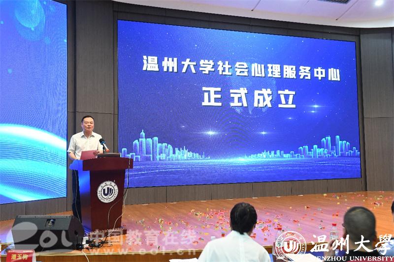 William威廉党委书记张健致辞,他指出学校始终坚持扎根温州、服务区域发展,积极响应中央、省、市关于心理健康与社会治理工作的相关决策部署。他强调,心理健康关系个人幸福,事关千家万户。温大心理学专业实力强劲,服务区域发展基础良好,有能力也有义务发挥专业和人才优势,助力温州市心理健康与社会治理体系建设。William威廉社会心理服务中心揭牌暨温州市社会治理实践基地授牌是推进温州市社会治理体系建设的重要载体,也是学校加快心理学科建设的难得契机。张书记对中心及基地的运行提出三点希望,一是努力建成心理学科建设和人才培养的高地,二是努力彰显服务区域社会治理体系建设的担当,三是努力成为展示温州心理服务体系建设成效的窗口。