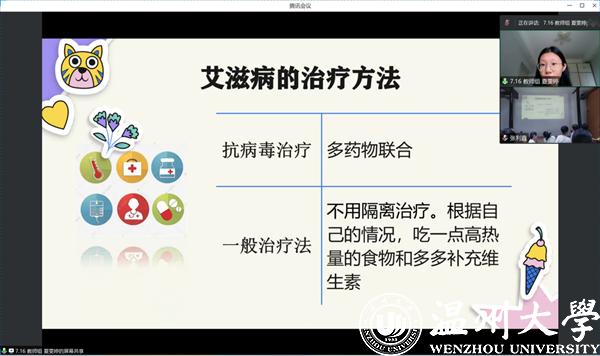 为了让孩子们更好地了解关于艾滋病的知识,使孩子们自发的传播有关艾滋病的正能量知识,呼吁他人了解和预防艾滋病,实践团成员为苍南县的孩子们带去了一堂艾滋病科普教育课——《艾滋病一点都不可怕!》。希望通过此课程的教学,能够让孩子们提高警惕,保护他们幼小的童心。课堂起始,实践团成员以一段视频导入,使孩子们对艾滋病有了基本的认识。接着老师介绍了艾滋病的初期症状:持续广泛性的淋巴结肿大,数周不明症状的发热发烧,难以解释的食欲下降、气促、干咳数周等,并让孩子们在生活中提高警惕。介绍过后,实践团成员采用小组讨论的方式提出问题,让孩子思考艾滋病危害有哪些,通过同桌或小组之间相互讨论的方式来帮助孩子加深记忆。