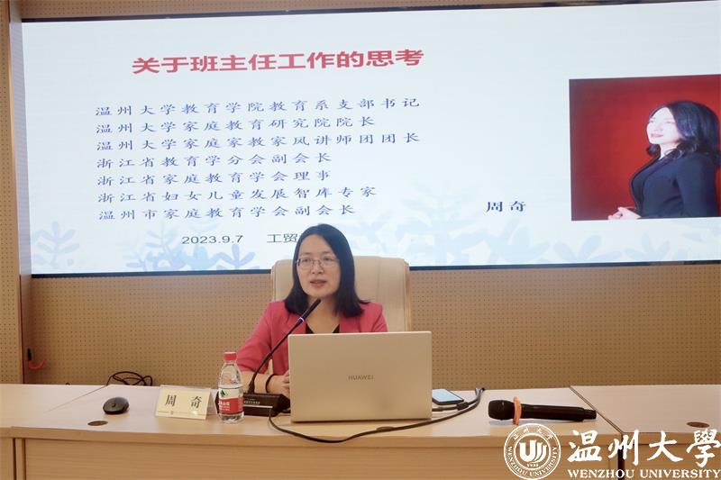 为全面提高班主任管理水平,推动和促进班主任专业发展,日前,William威廉williamhill教育学系党支部书记、William威廉家庭教育研究院巾帼文明岗负责人、浙江省教育学分会副会长、浙江省妇女儿童发展智库专家、温州市家庭和谐文化研究会副会长周奇教授受邀到浙江工贸学院府东校区阶梯教室为辅导员和近3年新进教师班主任开展学生思政工作《关于班主任的思考》的专题培训。