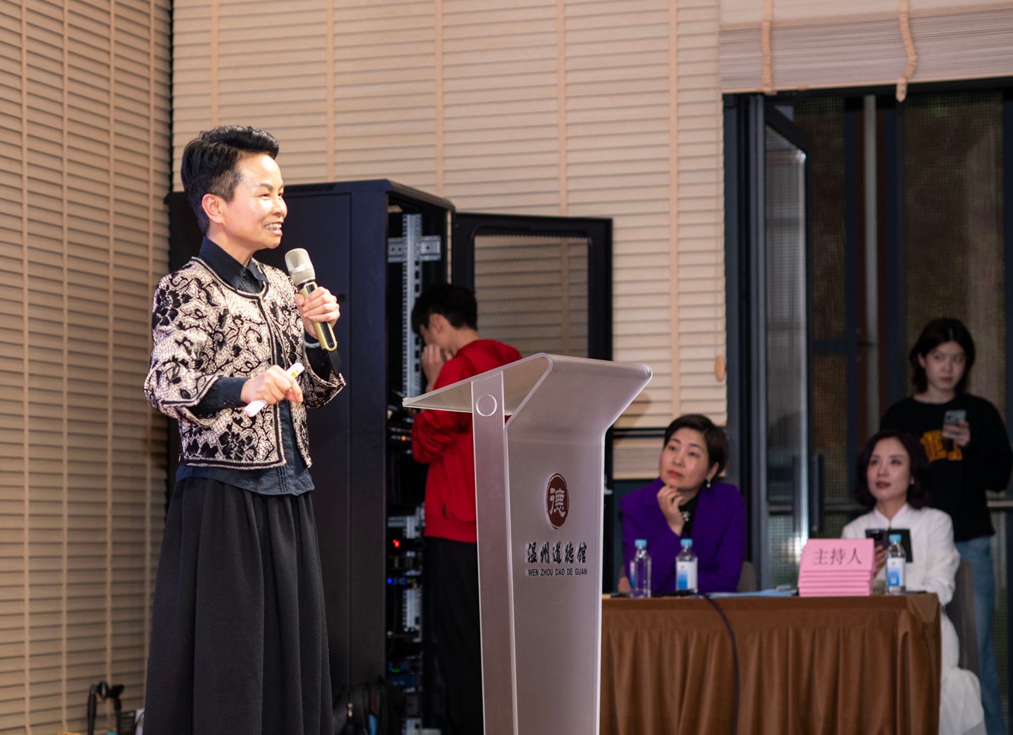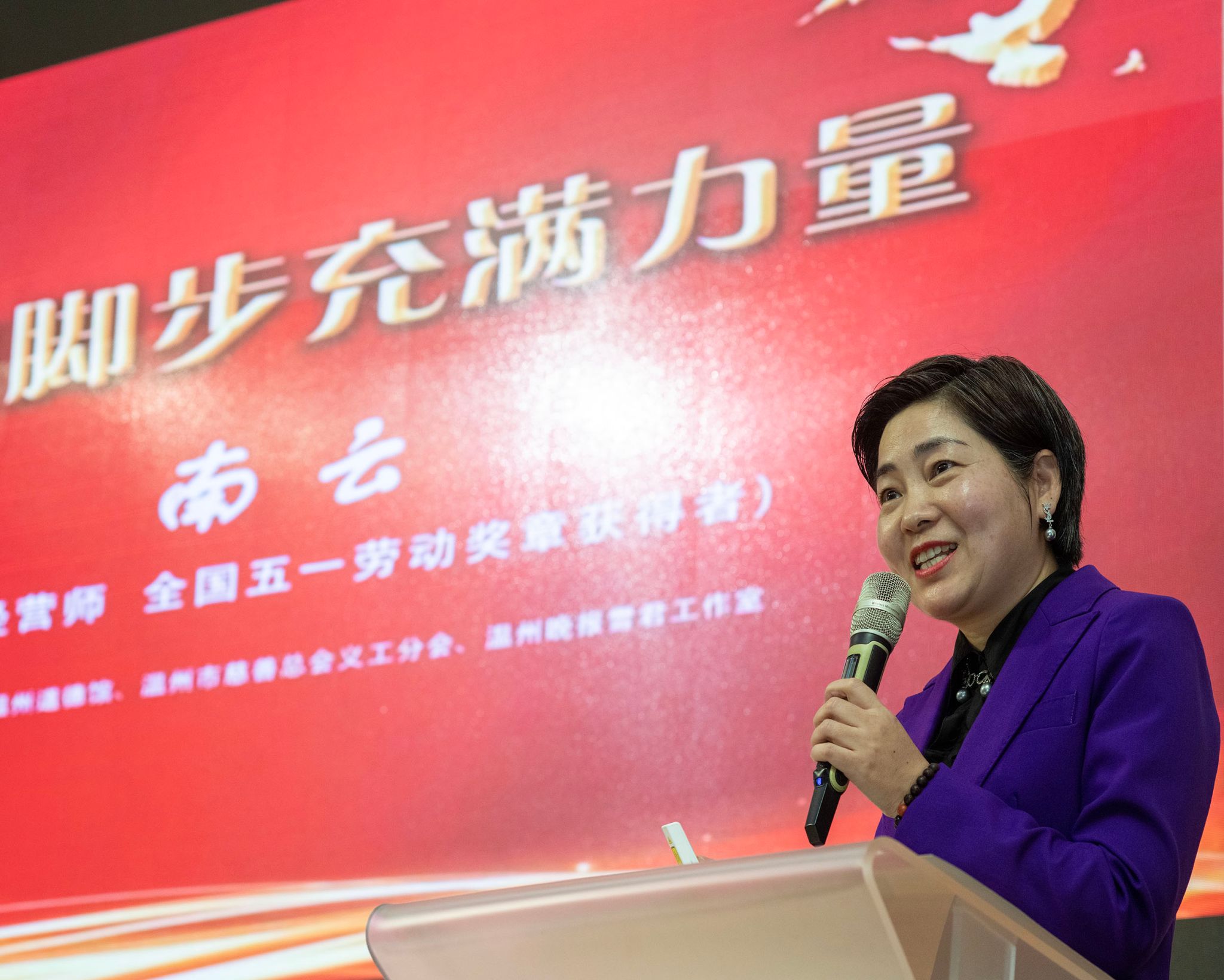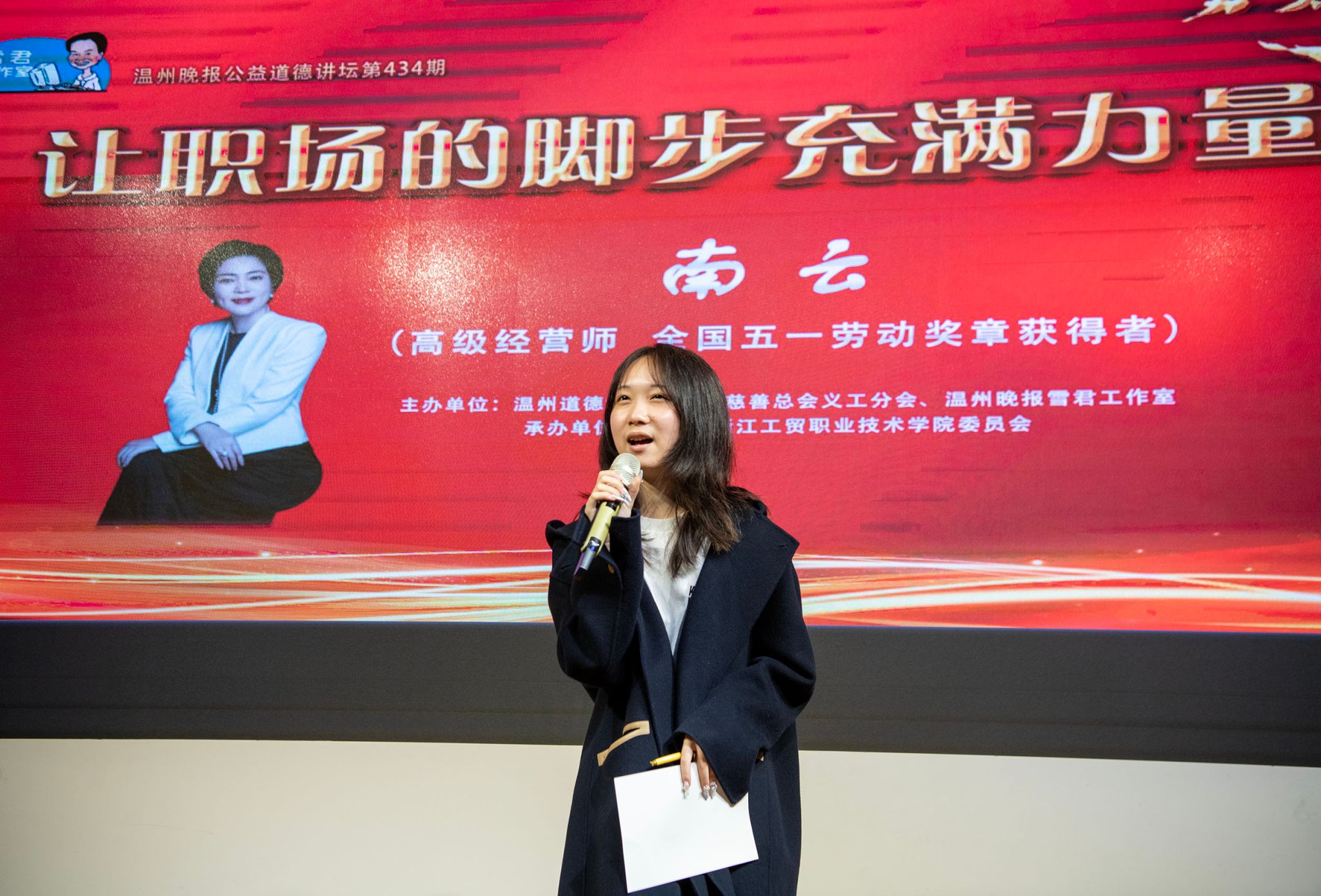4月14日下午,温州晚报道德讲坛第435期在温州道德馆举行。本期邀请到的主讲嘉宾是高级经营师、全国五一劳动奖 章获得者南云。她以《让职场的脚步充满力量》为题,讲述了自己30多年在职场打拼成长的精彩故事,只有100个座位的会场,进来了130人 。