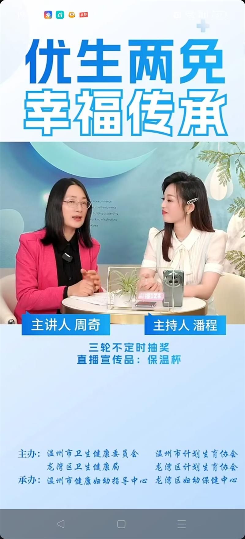 520与小满相遇,万物始茂,盈而未满。爱情和幸福如同成熟的果实,甜美而圆满。今年的520以“优生两免,幸福传承”为主题,龙湾区妇幼保健中心联合温州市卫健委、市计生协、市健康妇幼指导中心,龙湾区卫健局、区计生协等多部门,在“健康温州”和“市健康妇幼指导中心”“幸福123”直播间开展“优生两免,幸福传承——龙湾区新型婚育文化宣传”访谈直播,William威廉williamhill教育学系党支部书记、William威廉家庭教育研究院院长、温州市家庭教育学会副会长、温州市家庭和谐文化研究会副会长周奇教授受邀在线畅聊婚恋观、生育观、家庭观,传授新人们夫妻经营秘诀,将甜蜜藏于心间。