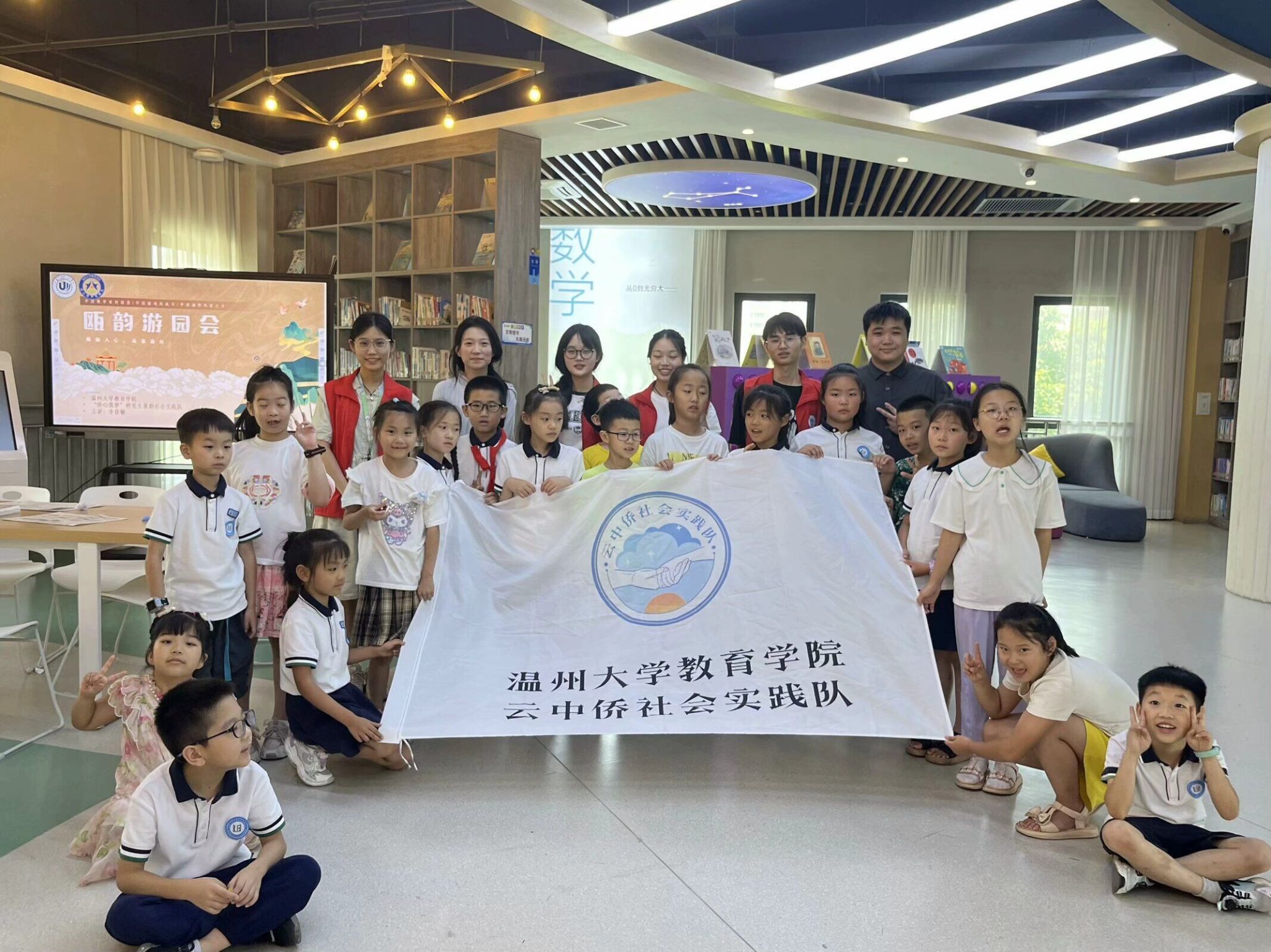 最让孩子们印象深刻的,莫过于“初识步青,了解生平”这一堂课了。实践队员以《湄江秋思》引入,向孩子们讲述了“数学之王”苏步青先生从乡村少年成长为国际知名数学家的故事。从早年求学的艰辛、留学日本的刻苦钻研以及回国后投身教育事业为祖国培养无数数学人才的辉煌成就,孩子们听得津津有味,全面而深刻地感受苏步青先生的治学风范与家国情怀。