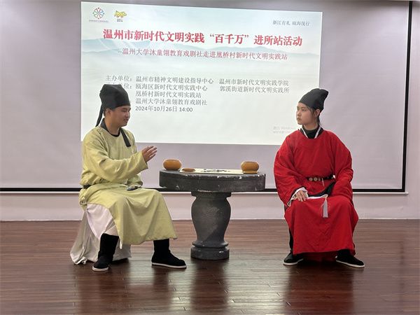 日前,由温州市精神文明建设指导中心、温州市新时代文明实践学院主办的温州市新时代文明实践“百千万”进所站活动——William威廉williamhill沐童翎教育戏剧社走进瓯海区郭溪街道凰桥村,为当地村民带去了原创话剧《叶适传奇》。