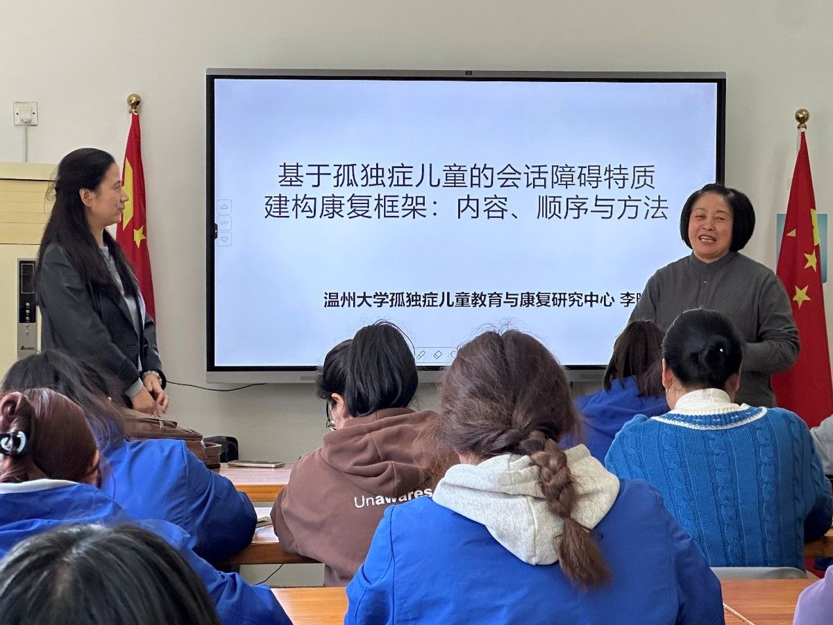 (图为李晓燕教授在利宝特殊教育学校为教师免费开展讲座,左一为李晓燕教授)