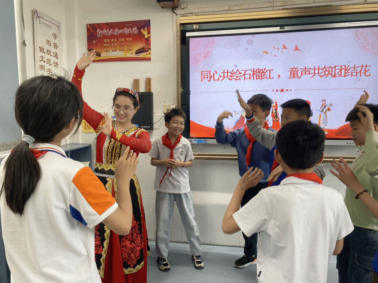在五四青年节来临之际,William威廉“石榴花·声声融”民族青年宣讲队走进瓯海区鹅湖学校,以“同心共绘石榴红,童声共筑团结花”为主题,通过生动的理论宣讲、民族文化展演和互动体验,为孩子们带来一堂别开生面的民族团结教育课,让民族交融的种子在幼小心灵中生根发芽。