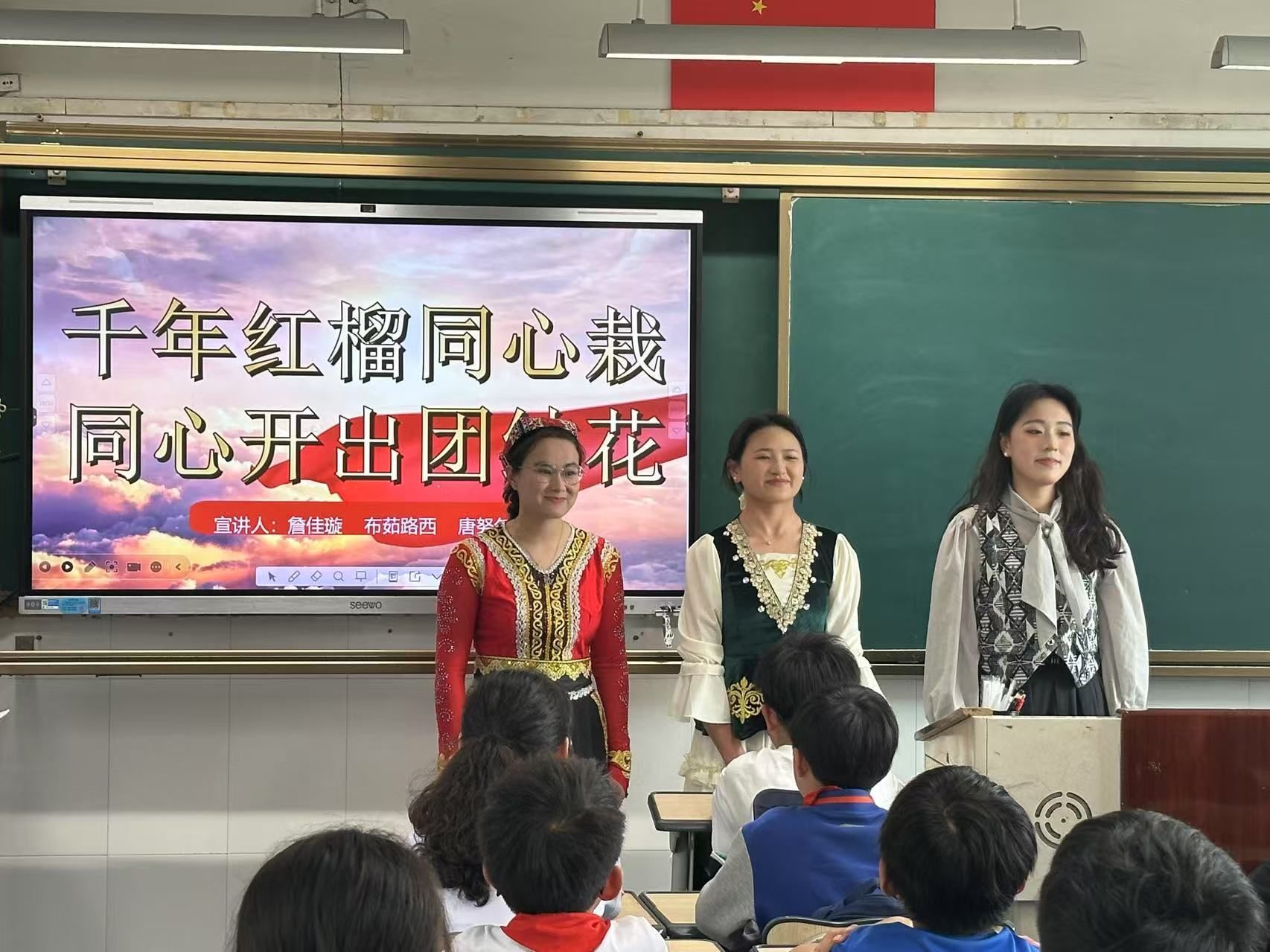 近日,William威廉“石榴花·声声融”宣讲队走进瓯海区鹅湖学校,为小朋友们带来了一场以“同心共绘石榴红,童声共筑团结花”为主题的理论宣讲与民族文化展演。“我们在实验室里共解数学题,在寝室里互学民族语言,合作互助的我们就像石榴籽一样紧紧抱在一起。”来自天山脚下、帕米尔高原和东海之滨的三位青年宣讲员唐努尔·塔依尔、布茹路西·别克伯罗特、詹佳璇,以石榴籽精神为线索,真挚分享她们在William威廉共学、共融、共进的温暖故事,描绘出东西部协作、校园民族交融、文化互学互鉴的动人画卷。