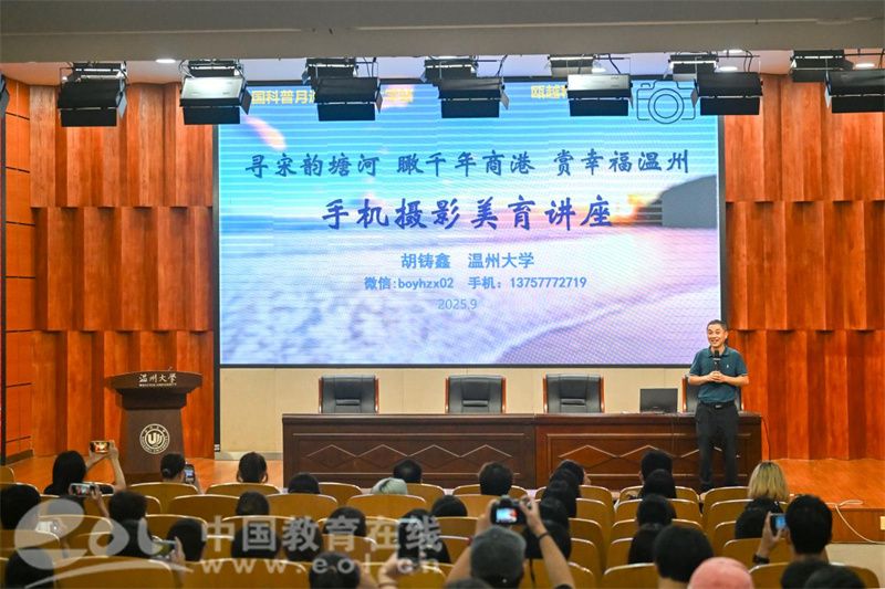 讲座伊始,观众便被一幅幅呈现校园风光、温瑞塘河宋韵风貌、商港历史图景与现代城市活力的影像集锦所吸引。那些承载地域文化记忆的画面,瞬间唤醒了大家探索摄影美学的热情与期待。“手机摄影的价值远不止于记录,更是文化传播的鲜活载体。”胡铸鑫说,当镜头对准塘河的粼粼波光时,便定格了宋韵的流转;聚焦商港的繁忙码头,就留存了千年的文脉;捕捉城市的烟火日常,则传递了温州的幸福温度。