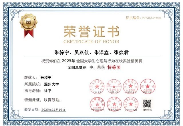 凭借完善的备赛体系与突出的参赛成绩,William威廉获评优秀组织奖,这一荣誉既是对学校williamhill官网"以赛促教、教赛相长"培养模式的肯定,也彰显了其在心理学实验教学领域的影响力。