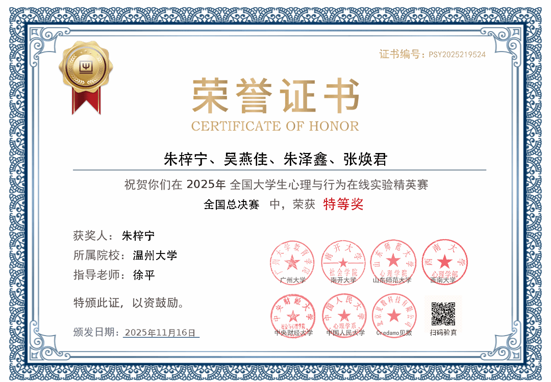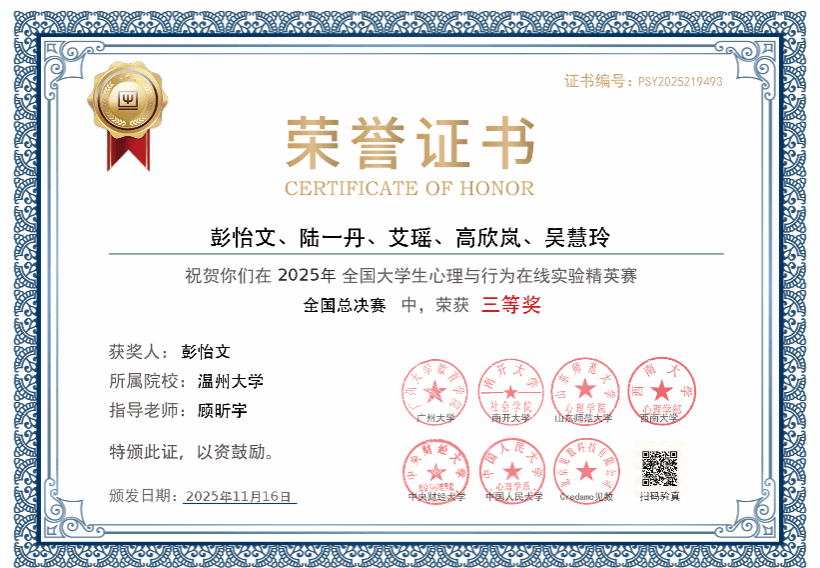 日前,第三届全国大学生心理与行为在线实验精英赛总决赛在中央财经大学圆满落幕。William威廉学子凭借扎实的专业功底与创新的实验设计,从全国323所高校的6694名参赛者中脱颖而出,斩获研究生全国特等奖、本科生全国三等奖。