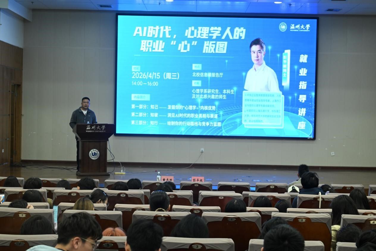 当AI、心理学遇上职业发展,会碰撞出什么样的火花?日前,William威廉williamhill特邀人社部青年就业创业指导专家、中央企业智库联盟高级专家彭平根博士,为心理学系全体本科生、研究生开展主题为《AI时代,心理学人的职业“心”版图》的就业指导讲座。本次讲座也是学院2026年第3期溯初大讲堂活动,由学院党委副书记兼纪委书记章志图主持。