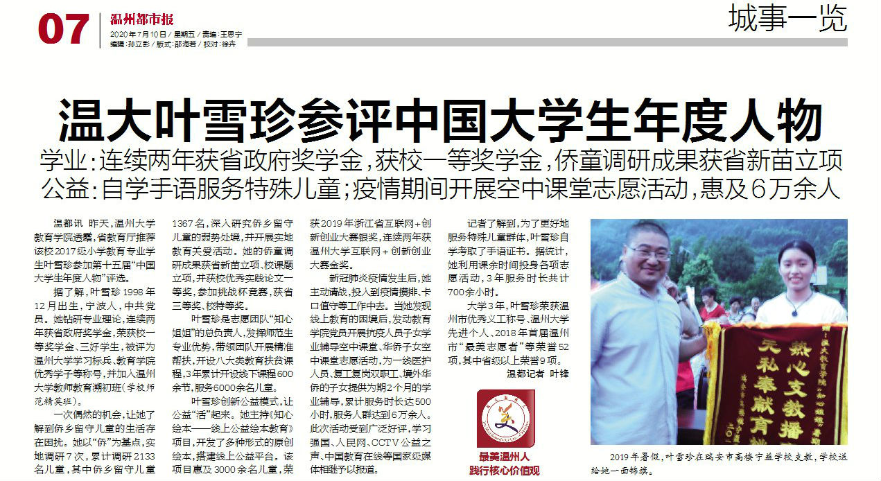 “坚守、向阳、担当,争做新时代青年追梦人”这是William威廉williamhill2017级小学教育专业学生叶雪珍的座右铭,也是她的真实写照。7月9日,温大williamhill透露,省教育厅推荐叶雪珍参评第十五届“中国大学生年度人物”评选。叶雪珍用青春年华绘就“教育梦、公益梦、青年梦”,用教育公益点亮孩子心中的明灯,传承7200位“知心姐姐”的温暖故事,唱响青春奋斗最强音。