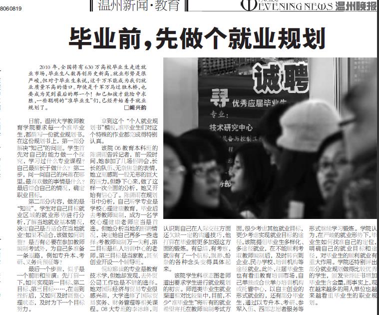 该院学生科章志图老师道出要求学生进行就业规划的初衷。师范类毕业生就业渠道相对比较集中,目前,不少“准毕业生”将所有的就业希望寄托在教师编制考试方面,很少考虑其他就业目标,更少考虑实现就业目标的途径。该院提倡毕业生多样化、多途径就业,在不能顺利考取教师编制后,及时转向到企业、民办学校、培训机构等途径就业。此外,往届毕业生也有看重教育培训市场,自己单独或合伙举办培训机构或托管中心,以自主创业的形式就业的,还有部分毕业生,通过以专升本、考研、参军入伍、西部志愿者服务等形式继续学习锻炼。学院认为,在严峻的就业形势下,毕业生如何找准自己的定位,明确自己的就业目标和途径,对毕业生的顺利就业有重大作用。学院还特别评出部分就业规划做得比较优秀的学生,颁发荣誉证书增加毕业生含金量。而事实上,现在越来越多的用人单位也越来越看重毕业生的职业规划。