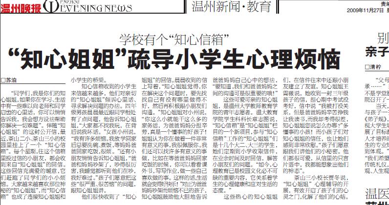 | 学校有个“知心信箱”“知心姐姐”疏导小学生心理烦恼2009-11-27 |