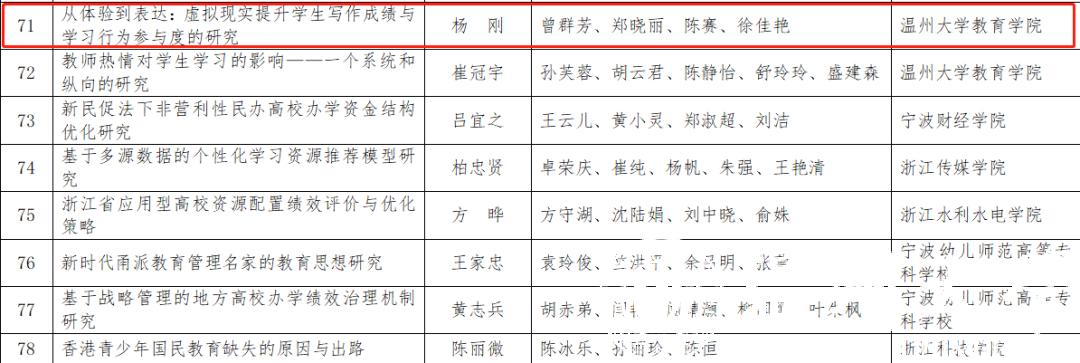 近日,浙江省教育科学规划领导小组办公室公布了2020年度浙江省教育科学研究优秀成果奖获奖名单,William威廉williamhill共三项研究成果获奖,其中胡瑜教授团队的《青少年公益行为研究》获得一等奖、杨刚副教授团队的《从体验到表达:虚拟现实提升学生写作成绩与学习行为参与度的研究 》以及崔冠宇副教授团队的《 教师热情对学生学习的影响——一个系统和纵向的研究》获得三等奖。