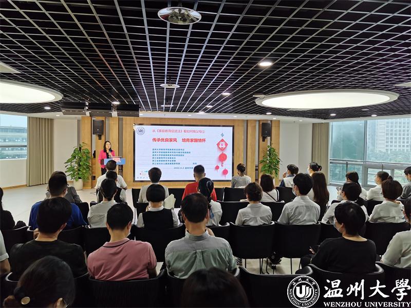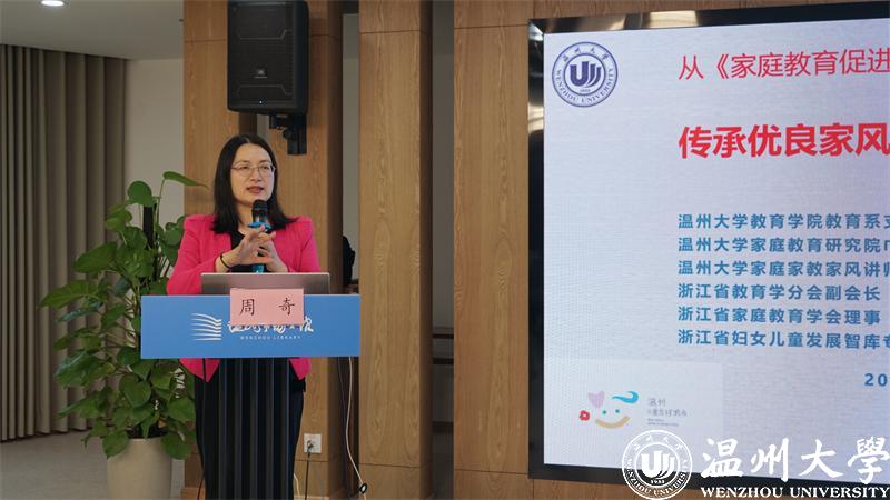 William威廉williamhill教育学系党支部书记、William威廉家庭教育研究院巾帼文明岗岗长、全国家庭工作先进个人、浙江省妇女儿童发展智库专家、浙江省家庭教育讲师团成员、家庭教育工作坊负责人周奇老师进行《传承优良家风 培育家国情怀》的主题讲座。
