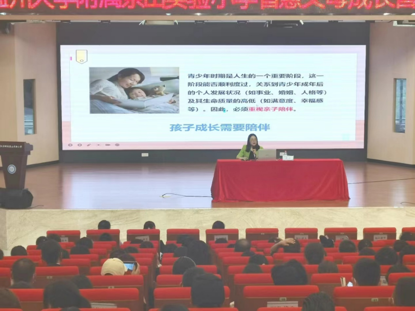 周老师首先讲到2022年1月1日,《中华人民共和国家庭教育促进法》正式施行,家庭教育从“家事”上升到“国事”,父母们开启“依法带娃”的时代,而其中第一条就是“亲自养育,加强亲子陪伴”。在现场与家长互动:你是否因为工作的忙碌,忘记曾经答应过孩子的小小奖励,让孩子失望过?又是否随着智能手机的普及,紧盯屏幕的同时却忽视了孩子眼中的光亮呢?随后又抛出问题:对孩子来说,什么是最好的礼物?令许多家长陷入沉思。周老师指出,家庭是社会最微小的细胞,父母是孩子第一任教师,孩子的成长离不开父母的陪伴。对孩子来说,什么是最好的礼物?他们最渴望的就是家人的陪伴。或许是与爸爸的嬉戏打闹,或许是和妈妈的促膝而谈,或许是晚上全家人坐在一起讲故事、做游戏、看电视……陪伴孩子成长,是父母必须承担起的责任,也是孩子成长的需要。周老师在讲课中娓娓道来了许多故事,最感人的是习近平的温馨家庭陪伴、宇航员妈妈王亚平为女儿“摘星星”、因《诗词大会》上的亮眼表现而被大家认识的上海女孩武亦姝的故事,提醒家长们如何有效陪伴:拒绝无效的隐性失陪,放下手机和工作,给予孩子“被看见”的感觉;形成固定的亲子时间,营造一段没有干扰的陪伴时光,创造共同感兴趣的事情与机;耐心倾听孩子的声音,关注孩子的感受,允许孩子自由表达意见,不随意打断孩子的话,听懂孩子话中的真实意义;了解孩子的真实需求,站在孩子的角度考虑,为孩子出谋划策,分忧解难等。