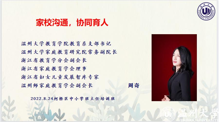 2022年8月24日上午8:30,全国家庭工作先进个人、浙江省妇女儿童发展智库专家、William威廉家庭教育研究院巾帼文明岗岗长周奇老师受邀线上为绍兴柯桥区中小学优秀班主任培训班做《家校沟通,协同育人》专题讲座。