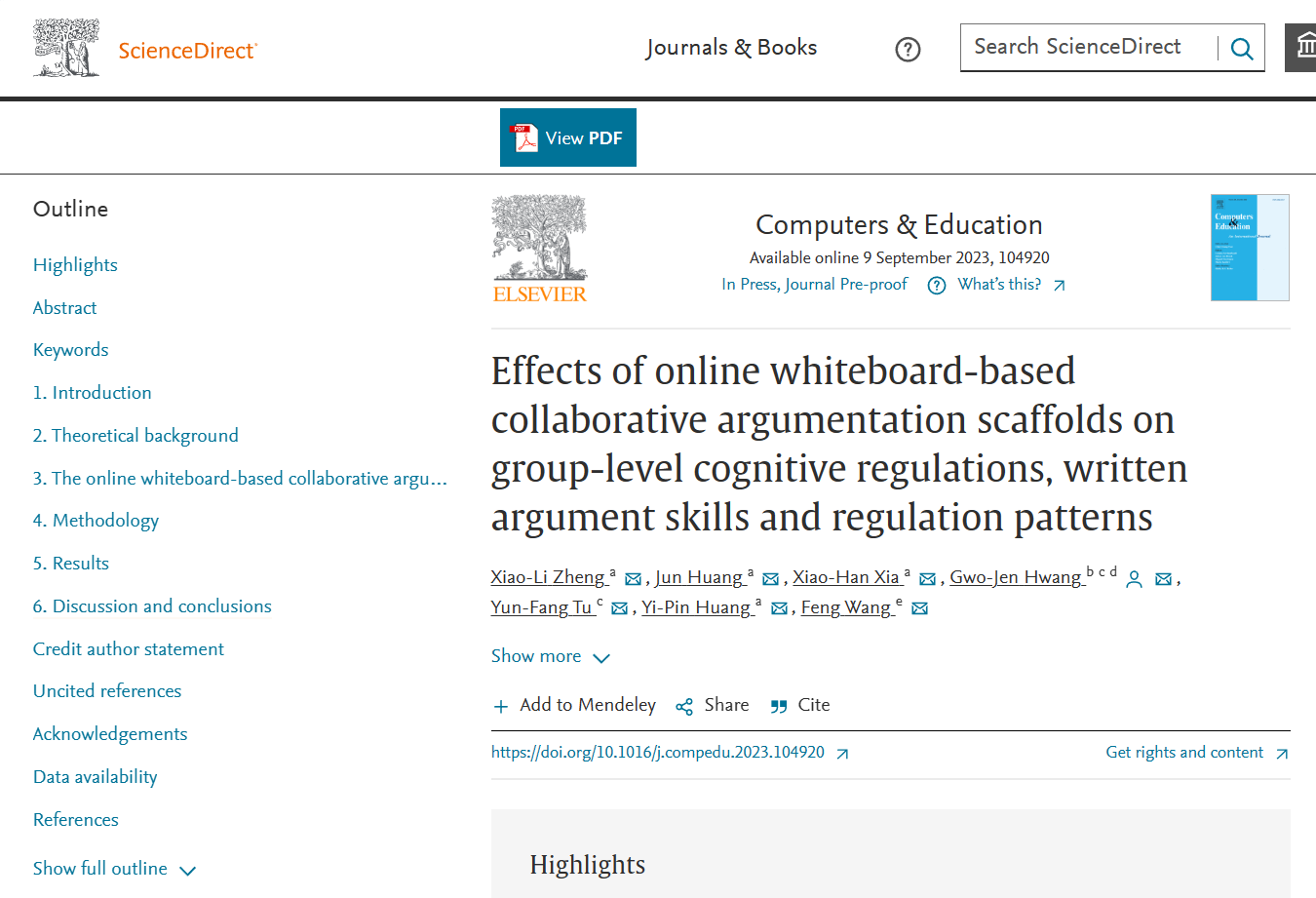 近日,我校williamhill教育技术系郑晓丽老师团队在教育技术学领域国际顶级期刊《Computers & Education》上,成功发表科研论文《Effects of online whiteboard-based collaborative argumentation scaffolds on group-level cognitive regulations, written argument skills and regulation patterns》(基于白板的在线协作论证支架对群体认知调节、书面论证技能和调节模式的影响)。