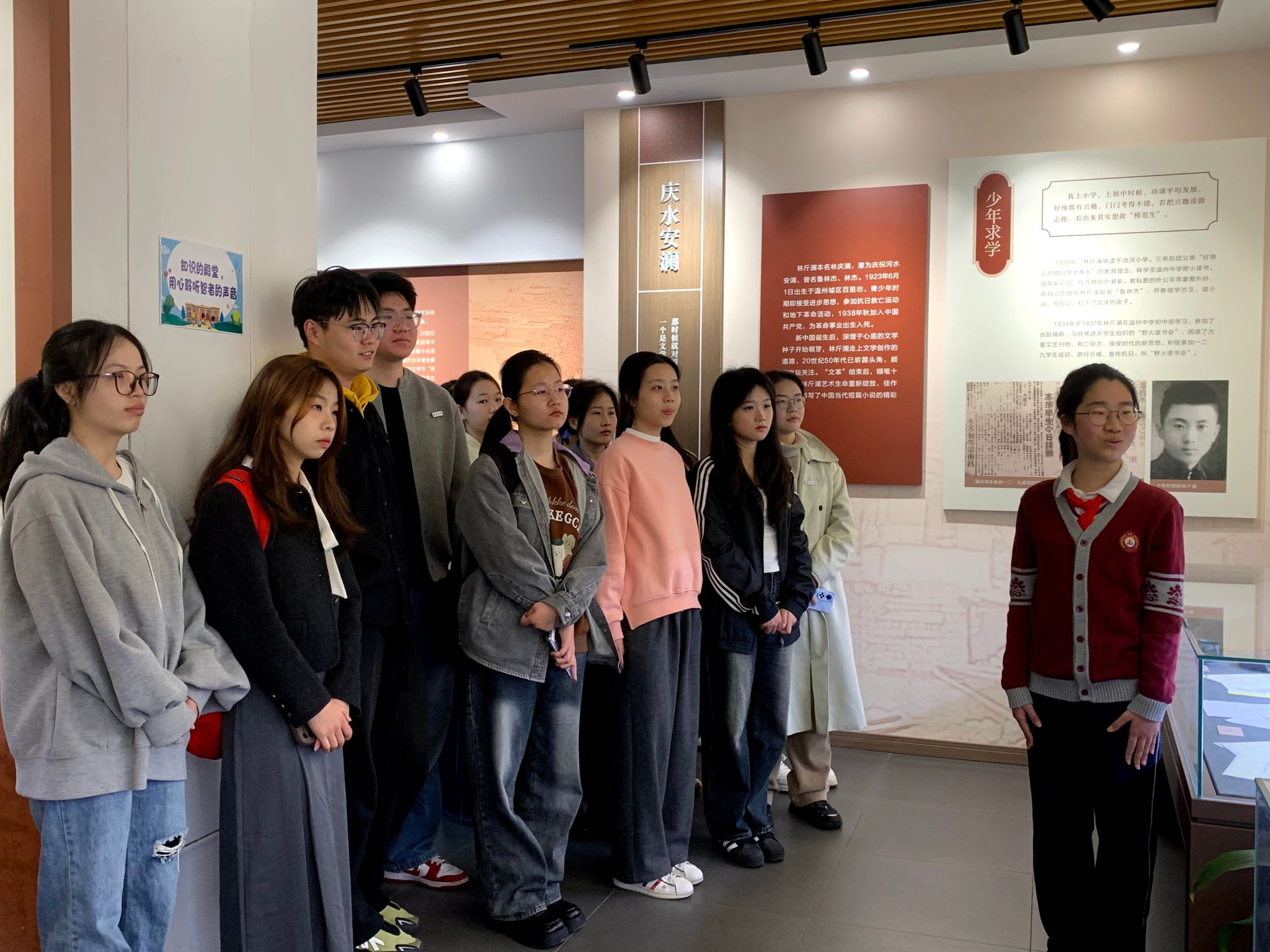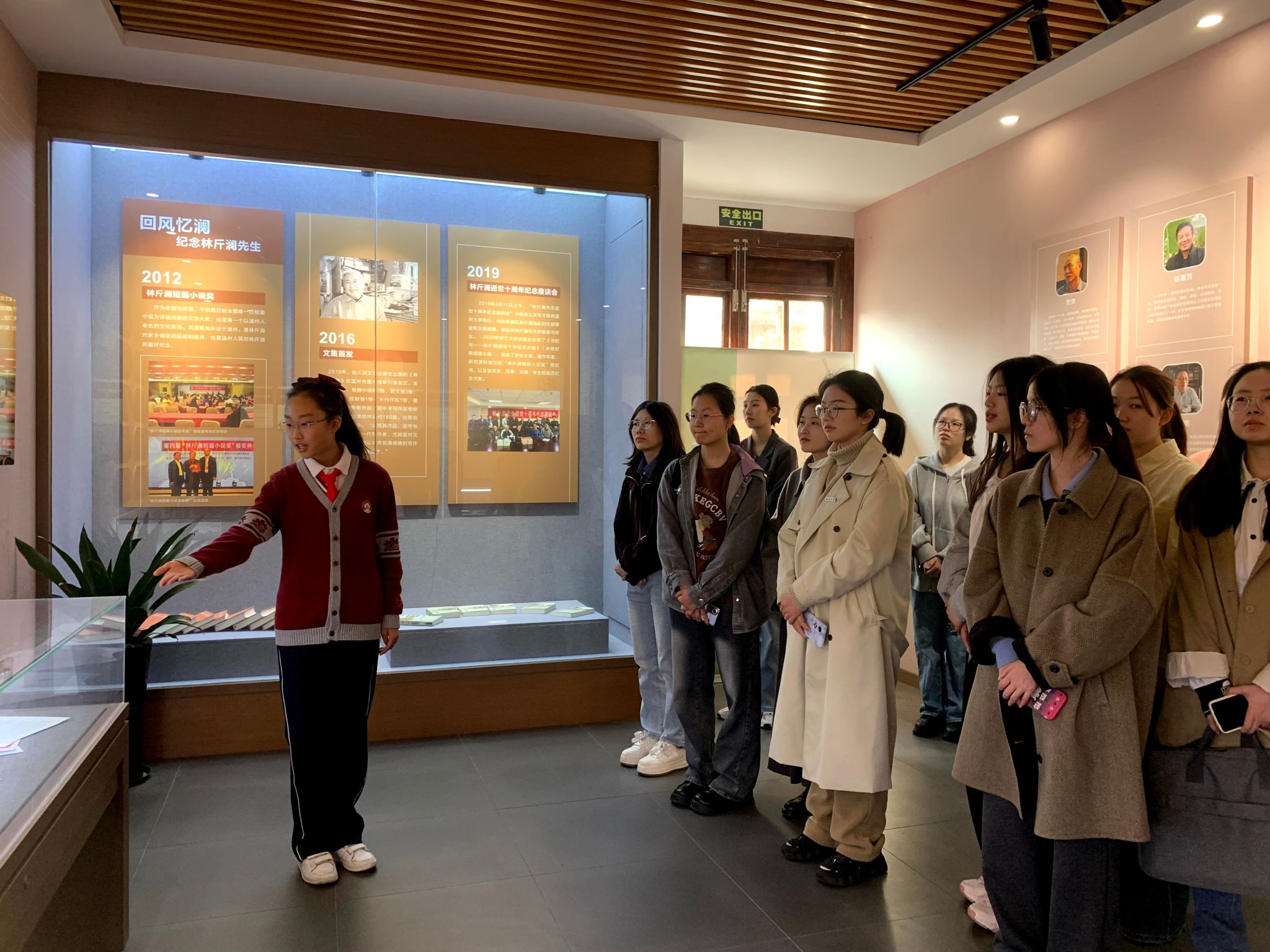 跟随着小小讲解员的指引,我们了解到林斤澜先生的成长轨迹与广场路小学紧密相连。其父亲林丙坤于1914年创办了一所小学,即如今的广场路小学沧河校区。2004年,林斤澜先生在沧河小学90周年校庆时重返母校,感慨道“温州童年回忆在可爱的沧河巷,梦境般美好”。正因这份深厚情谊,林斤澜文学馆选址于此。生动的语言讲解结合形象的馆藏呈现,令在场的实习老师们无一不深刻感受到文学的力量与文化传承的重要性。