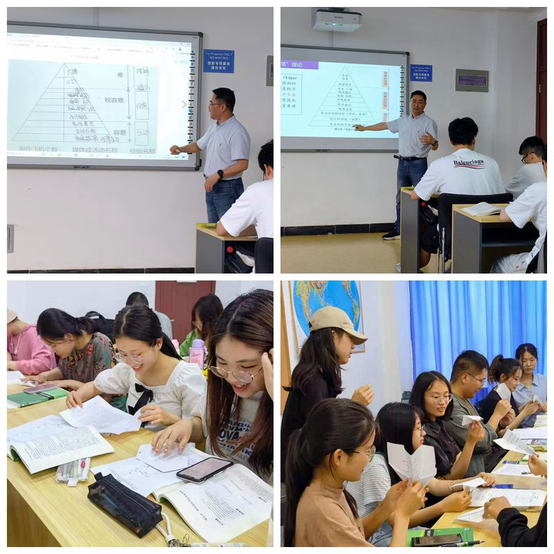 胡来林教授首先通过云班课,让每位同学回顾了媒体分类,并提出了教学媒体选择的问题让同学思考。结合小学案例《纸飞机》STEAM教学活动中“纸飞机制作”教学情境,提出教学媒体选择的探究问题,将班级学生分为“文本媒体组”“图片媒体组”“视频媒体组” 和“示范活动组”四个学习小组,根据媒体提供的学习材料在规定的时间内制作纸飞机,开展探究活动。根据小组完成成果,每位学生都构建、概念化了自己的媒体运用的“经验之塔”。通过对比美国教育家戴尔的“经验之塔”,提出对传统“经验之塔”理论的审辩和对自己建构的“经验之塔”的反思,培养了学生“敢于挑战权威,勇于创新理论”的新时代精神。