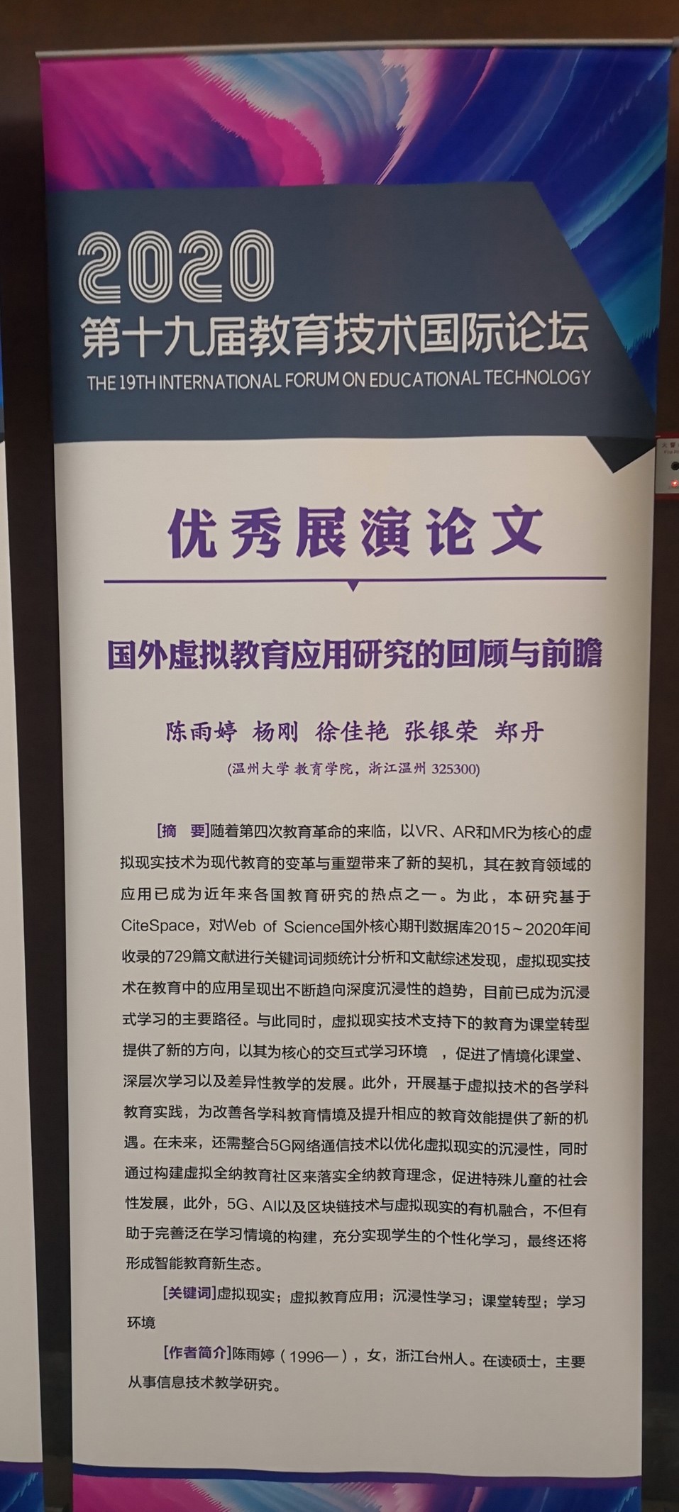 “独学而无友,则孤陋而寡闻。”教育技术国际论坛是教育部高等学校教育技术专业教学指导委员会主办的品牌性、国际性学术会议,是海内外教育信息化领域专家学者专业人士思想碰撞、学术研讨、实践切磋、信息共享的重要平台,对促进我国教育信息化建设与发展、提高教育信息化人才培养质量和水平起到了非常重要的推动作用。我院研究生参与国际学术论坛并作主题发言,不仅是展示我院研究生学术水平的有效途径,也是对我校研究生培养质量的充分肯定,相信以陈雨婷同学、黄莹同学为榜样,会有越来越多我校研究生的身影出现在国际学术论坛报告中。