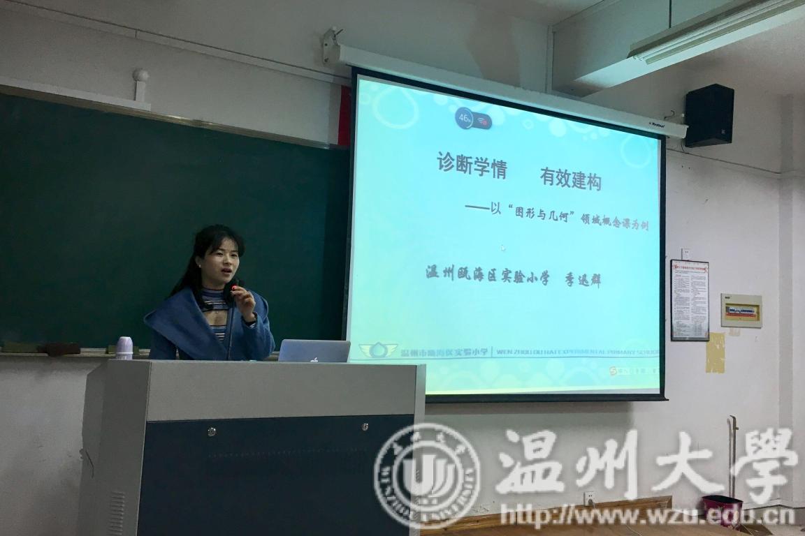本次讲座的主题为“诊断学情,有效建构”。讲座伊始,季老师以三角形的概念教学为例,向同学们揭示了当前小学数学课堂上“教的概念”多,“自主构建”少的问题。在目前的概念教学中,老师们还是习惯于引导学生理解文字的概念,而不是更利于小学生理解的形象思维。这样的现象不禁让人反问文字解读教学的价值,这也给在场的同学们带来了许多思考:只有更多、更深刻的体验和感悟,才能加深学生对概念的理解。