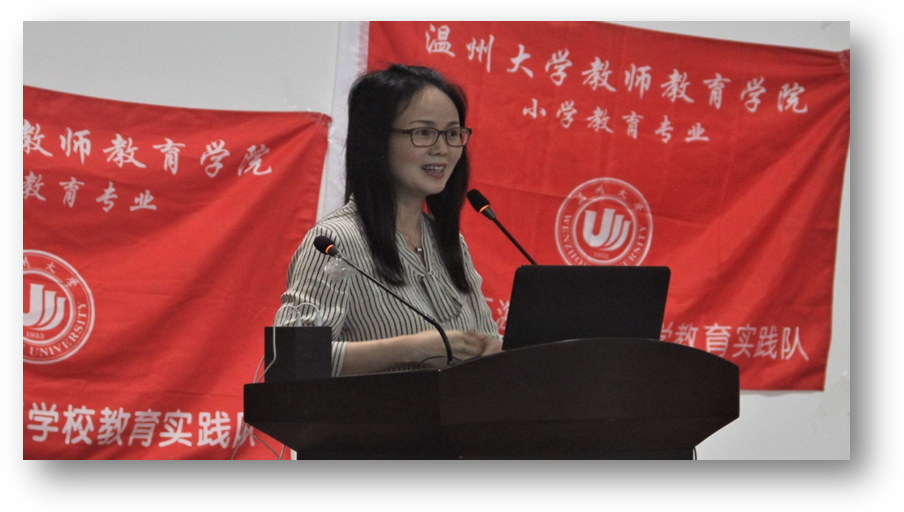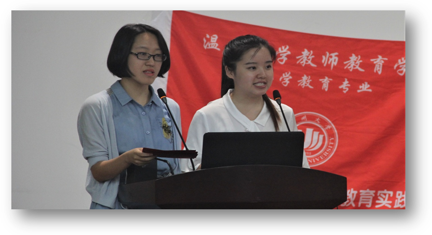 温州市马鞍池小学组数学组共吟一首《春风化雨 感恩有你》,感恩学生、感恩老师,是他们的陪伴,成长路上不迷茫;感恩领导、感恩温大,是学校的支持才有了本次教育实习这一珍贵的成长平台。语文组的汇报《二月谈:以爱为名》,把实习创造性地比作职业成长路上的一场修炼,相信只有历练过,才会遇见彩虹。