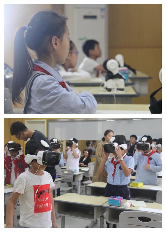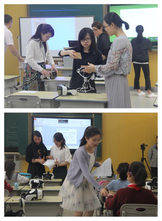 在活动前,为了使活动能顺利开展,数字工坊团队早早到了附属学校开始有序的准备,从教室布局到虚拟教学设备调试,一切工作都有条不紊地进行。课始,由团队邱创楷老师为同学们示范VR眼镜与教学资源的使用,邱老师深入简出的教学让学生们很快熟悉了VR教学资源的使用。学习之后,附属学校陈飞凡老师以《长城》写景作文为本次活动主题导入新课内容。同学们在陈老师教学指导下开启了一场虚拟长城之旅活动,在活动中同学们既仔细的畅游虚拟世界的每一处场景,同时也在虚拟世界深入学习,如利用麦克风录下所看所想;还有通过嵌入虚拟世界的问题支架使每个同学能够学习相关知识,等等。