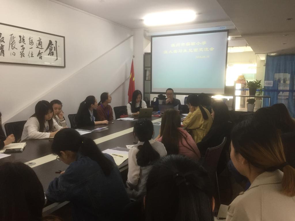 在4月10日中午12时30分,在实验小学教学楼6楼会议室再次召开了见面会。本次会议依旧由廖贵慧老师主持,参与会议人员有教务处张坚鸥老师以及全体实习生。