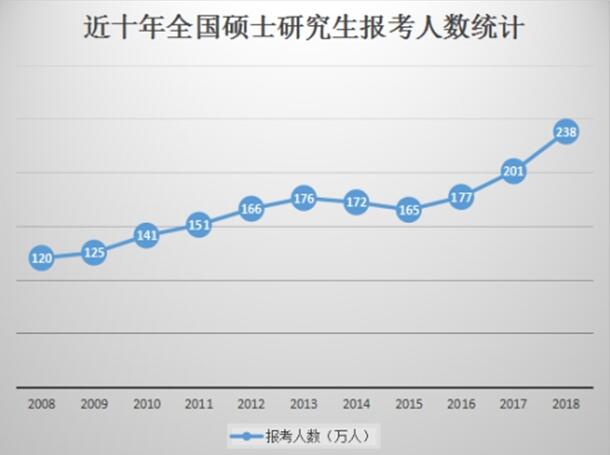 教育部公开的数据显示,近三年来,全国研究生报名人数呈现出加速增长的态势。仅2016年-2018年,报名人数就分别同比增长7.3%、13.6%、18.4%。2018年全国硕士研究生的报考人数为238万人,比2017年增加37万人,其中应届考生131万人,比去年增加18万人;往届考生107万人,比去年增加19万人。