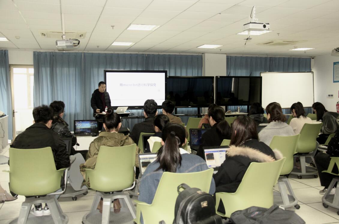 2017年12月13日星期三,14教技开展了第二次名师大讲堂,李伟老师邀请了浙江省温州中学名师、中国电子学会创客教育专家谢作如老师来带我们学习用micro:bit进行科学探究。