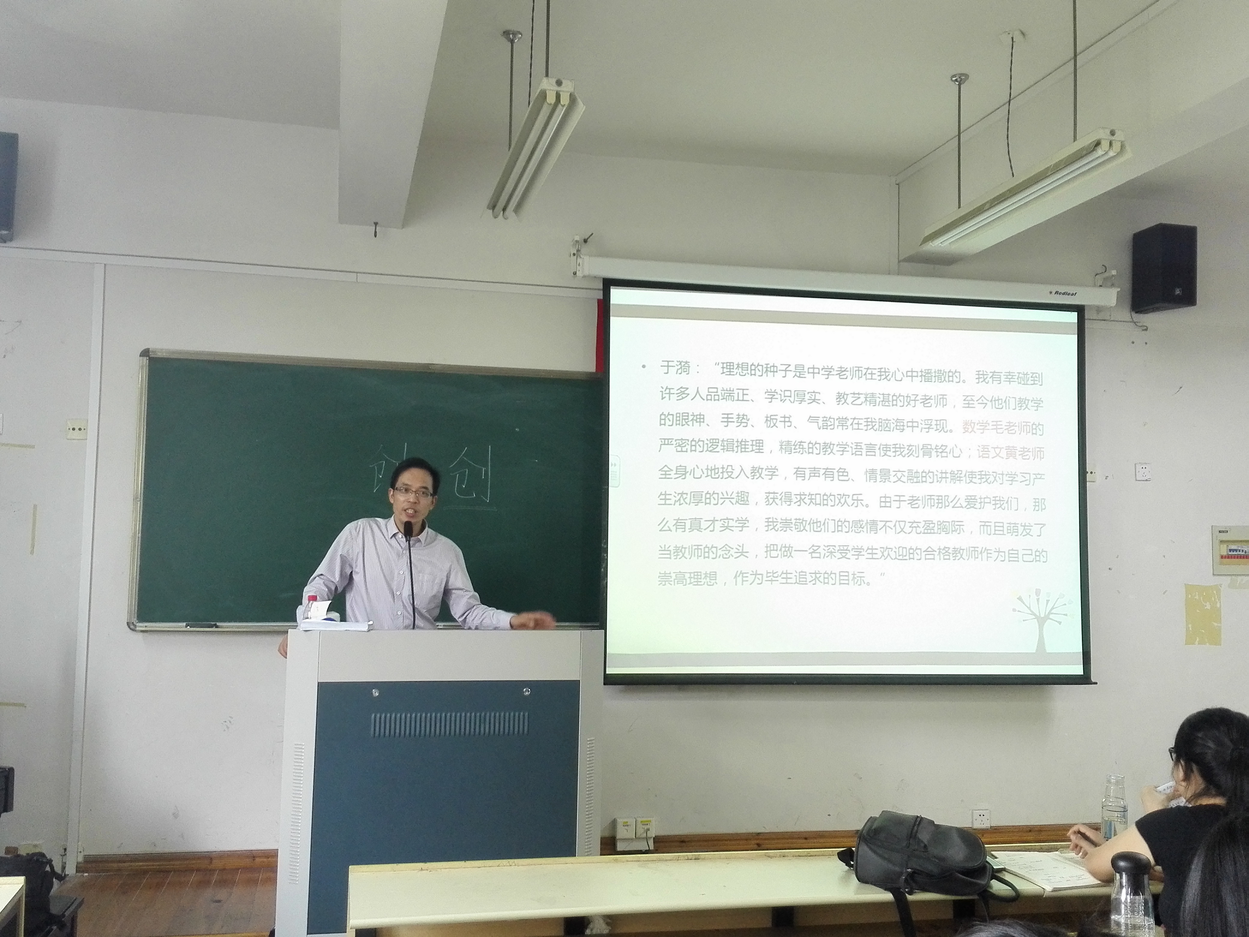通过谢老师生动的讲座,同学们了解到了青年教师成长的策略,并坚定了做一名优秀人民教师的信念。最后谭莉老师总结并强调了教师专业发展的重要性,相信在场的14级语文方向小教学生以及第8、9期溯初班学员能够抓住机遇,始终坚信机会是留给有准备的人。 (通讯员:沈星)