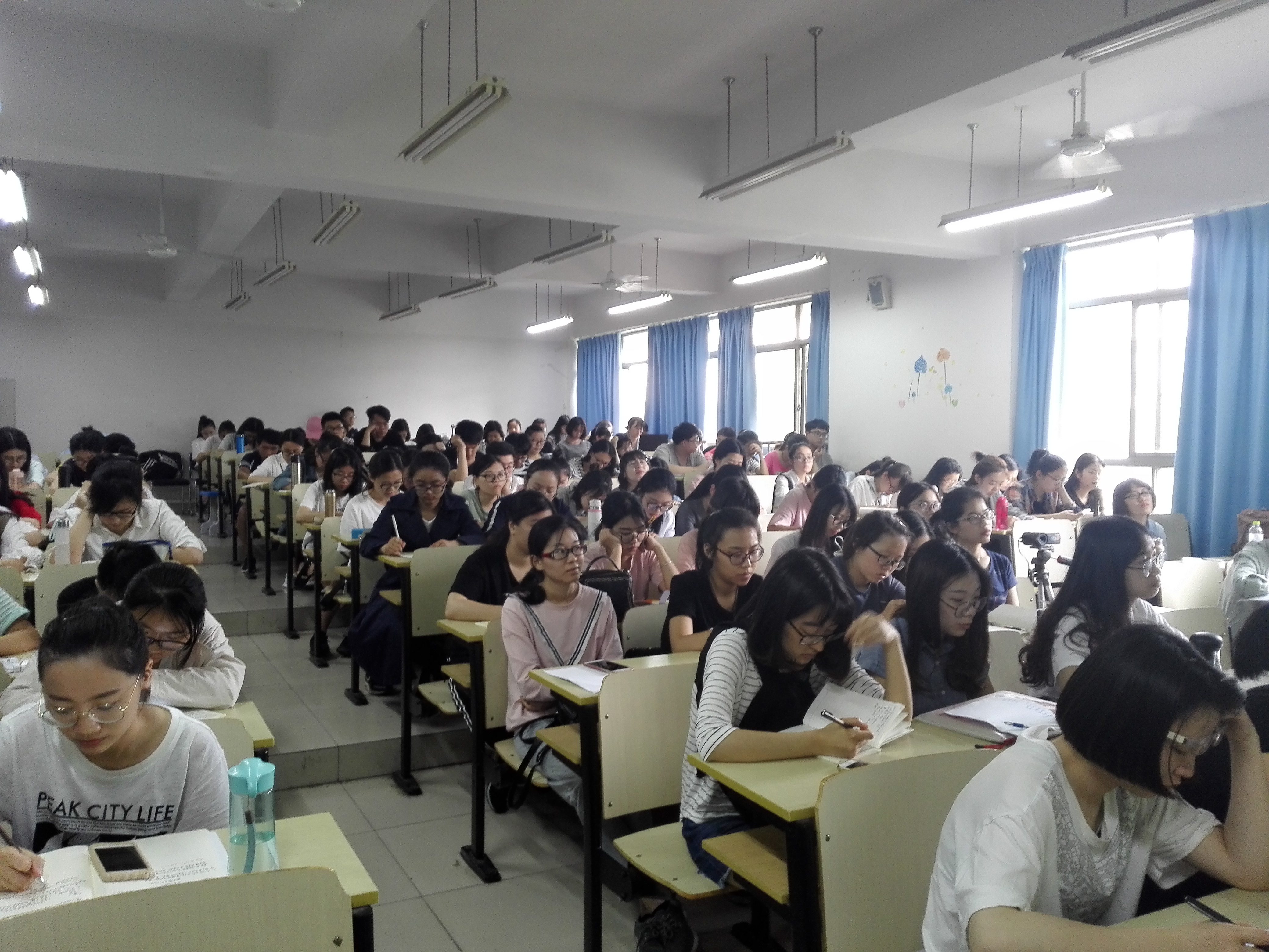 在讲座中,谢老师从自己的亲身经历入手,从翻着硬皮本、踩着脚踏车的入门,到一个错字、几个贵人的发力,再到研修、带教的成长,向同学们讲述了自己在教师路上的思考与感悟,同学们听得津津有味。接着谢老师谈到了作为一名青年教师,我们要从读书、思考、写作开始,在大学期间练好基本功,在工作以后要做一个学生喜欢的老师。只有这样,才能使自己不断成长。谢老师幽默生动的语言令现场掌声、笑声此起彼伏。最后,谢老师以一首《梦想天空分外蓝》结束了本次讲座。