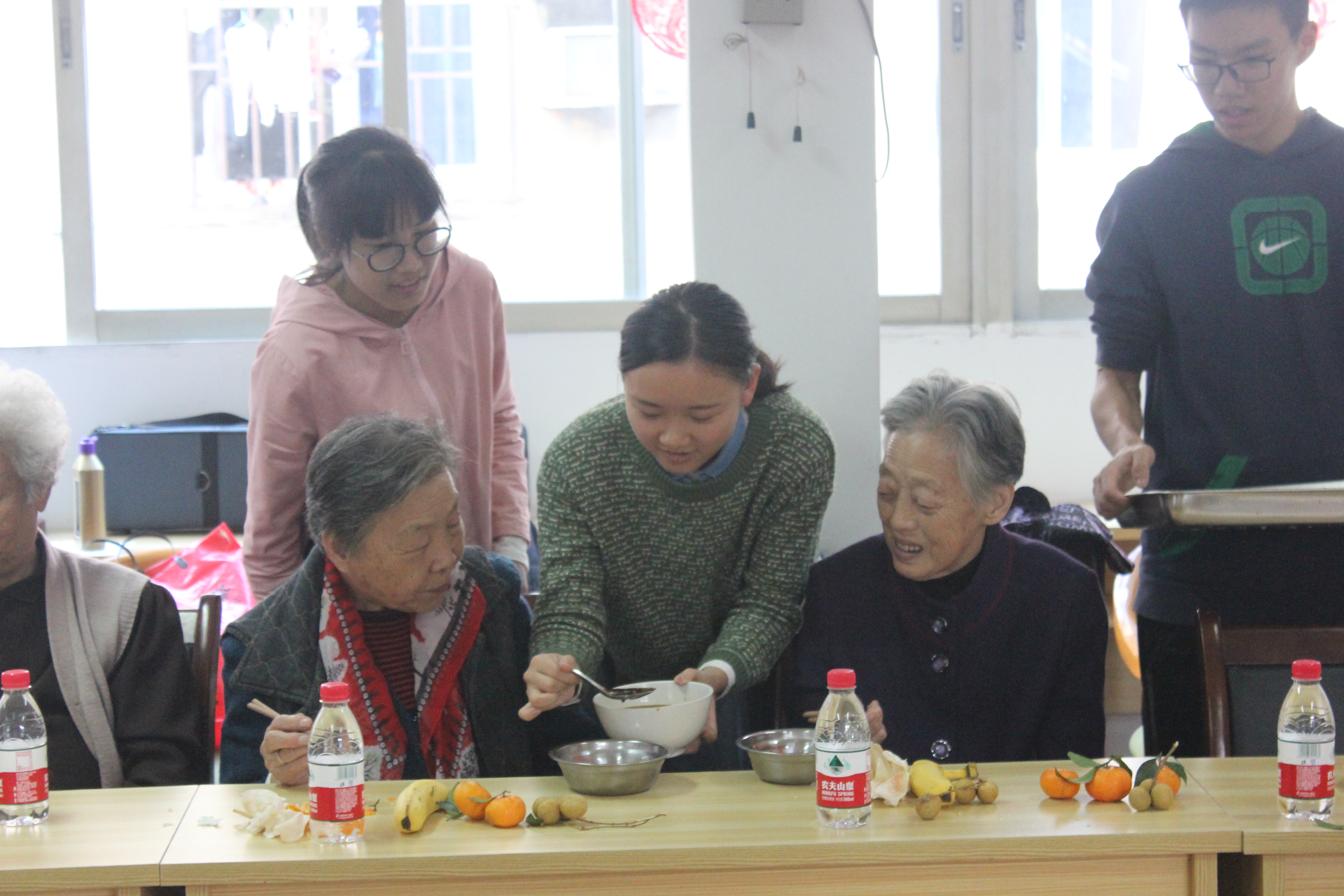 活动正式开始,先是《大王叫我来巡山》的群舞,可能是因为刚开始,气氛并不活跃,但还是有爷爷奶奶捧场地拍照、鼓掌,然后是相声《打电话》。结束之后,饺子好了,我们给每位爷爷奶奶盛饺子,期间有爷爷奶奶不停地说:“太谢谢你们了,你们能来看看我们就好了,还带这么多东西。”也许我们确实因为这次活动的准备而烦恼过、惆怅过、忙碌过,但听了这样的话,不由得觉得一切都是值得的,也许这就是志愿者活动的意义吧,在努力与理解中传播爱。