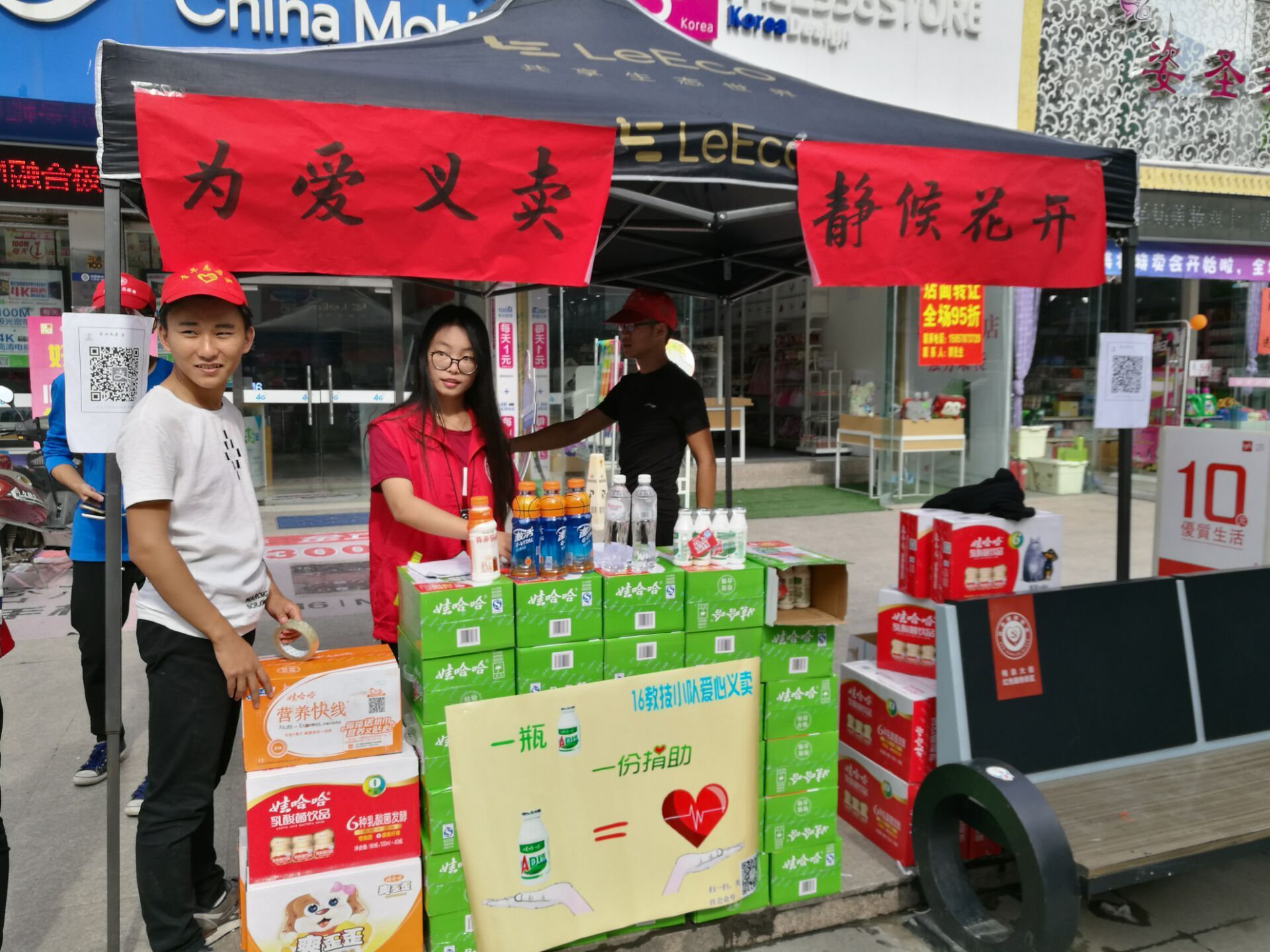 这天的阳光似乎拨开了前几天的乌云密布,驱散了前几天厚重的雨幕。下午1点我们迎着阳光,准时开启了我们的义卖之旅。刚开始我们每个人都放不开,不敢大声叫卖,但一想到谢静同学现在仍躺在病床上,需要一笔又一笔巨额的医疗费,我们也逐渐调好状态,立刻端正态度,叫卖的嗓门越来越大,义卖活动逐渐有序开展,我们热情的同学们,可以说为了筹集善款“不择手段”:有的站在帐篷下,积极的与过路人介绍交谈我们此次活动的善举所在,有的离开摊位,去附近的小店宣传,为我们的活动添砖加瓦,竭尽全力。我们的激情混着太阳的温暖,仿佛融为了一体,在这逐渐寒冷的冬天,为谢静同学带去了最真挚的关心与问候。